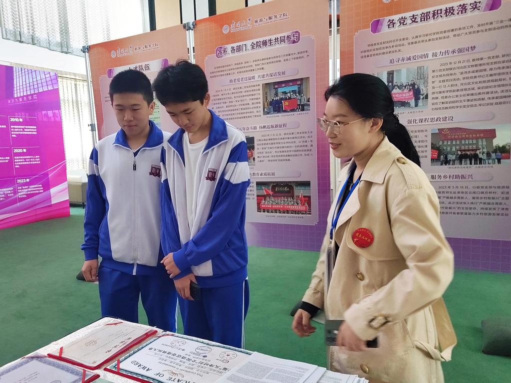 活动当天,志愿者们佩戴统一的党员先锋岗徽章和胸牌等候在学院大厅,每当有高中生和家长们走进楼内,便热情上前提供帮助。