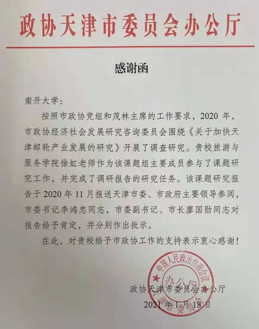 查看详情2020年,我院徐虹教授作为主要成员参与了天津市政协经济社会发展研究咨询委员会《关于加快天津邮轮产业发展的研究》课题,并完成了调研报告的研究任务。该课题致力于在构建邮轮产业发展的全产业链体系、打造中国北方邮轮旅游中心、加快天津邮轮产业发展等方面提出具体建议和重要举措。该课题研究报告于2020年11月报送天津市委、市政府主要领导参阅,市委书记李鸿忠同志,市委副书记、市长廖国勋同志对报告给予肯定,并分别作出...