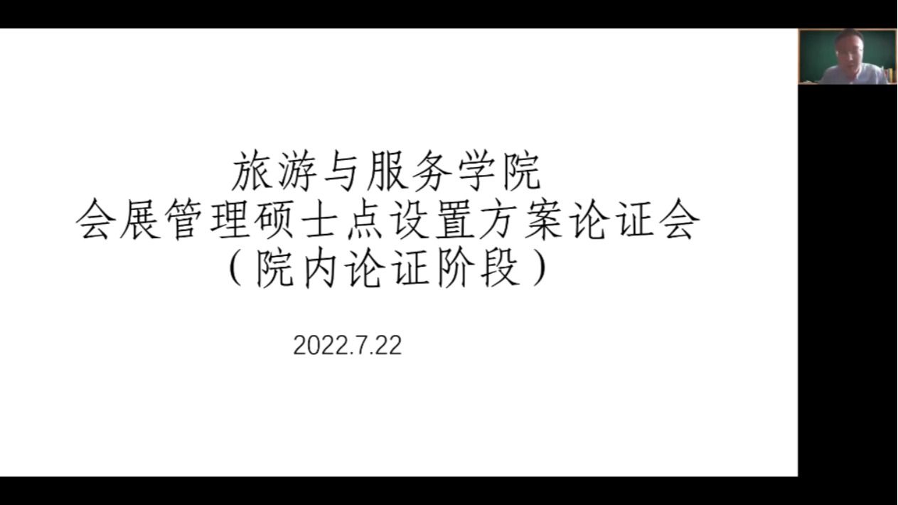查看详情7月22日,我院线上召开关于增设会展管理硕士点申报工作的院内论证会,学院王成辉书记、徐虹院长、旅游管理学位分委员会成员以及会展管理硕士点申报工作小组的各位老师,共15人参加了此次会议。会上,姚延波副院长就会展管理硕士点论证材料的组织撰写情况做了简单介绍,周杰老师整体汇报了论证材料的撰写思路,随后,与会老师就我院会展管理硕士点设置的必要性和可行性、增设专业的名称、研究方向的设置、数据的更新、各研究方向...