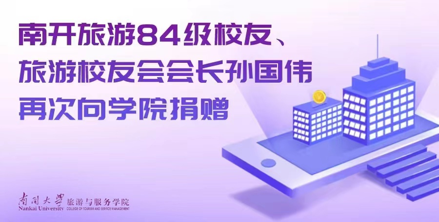 2022年11月16日,南开旅游84级校友、旅游校友会会长孙国伟向南开旅游发展基金再次捐赠人民币10万元。孙国伟校友一直心系学院建设,自2019年以来,已连续四年向学院捐赠共计40万元,在校友会工作方面也始终致力于服务校友、反哺母校,着眼于为校友和学院搭建沟通合作的桥梁、对接校企资源,促进旅游专业知识教育、人才培养与行业实践相结合,不断为学院发展建言献策、提供捐赠资金支持。本次学院获得的校友捐赠基金将根据捐赠人...