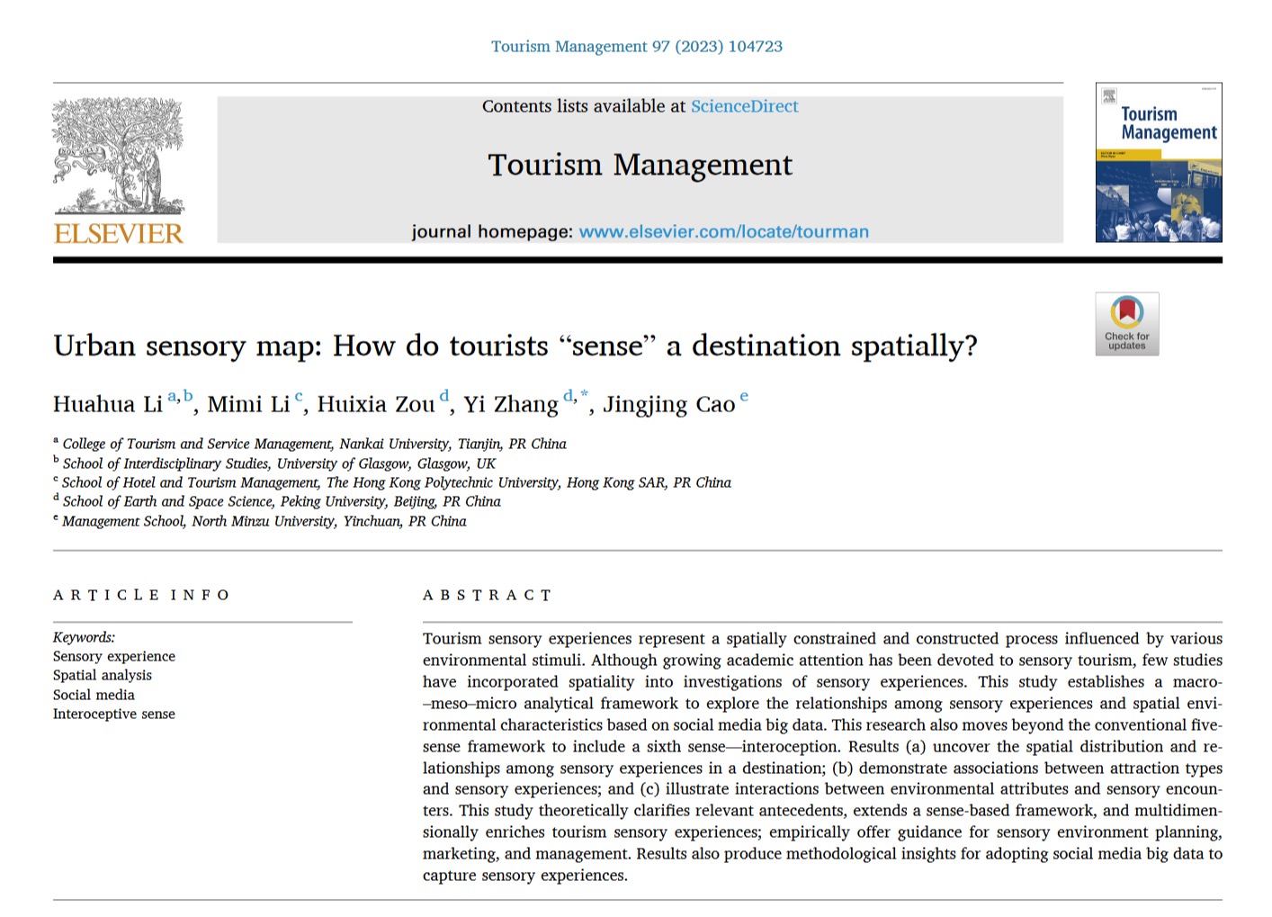 查看详情近日,我院博士生李婳婳作为第一作者与校外合作者共同完成的研究成果《Urban sensory map: How do tourists “sense” a destination spatially?》被旅游管理学科国际三大顶尖期刊之一的《Tourism Management》接收并发表。此论文是该博士生在旅游感官领域的系列成果之一,该研究以微博内容作为数据源,通过构建宏观-中观-微观空间分析框架,探讨目的地游客感官体验在全局与局部空间范围内的集聚性与分布性规律,揭示不同空间里...
