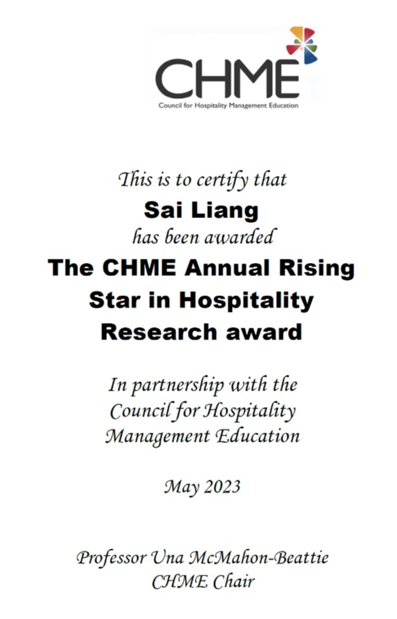 近日,2023国际酒店管理与教育委员会(Council for Hospitality Management Education,CHME)年度会议在荷兰举办,会议上授予了我院梁赛副教授 “the CHME Annual Rising Star in Hospitality Research award”(年度研究新星奖),以表彰其在酒店管理研究方面的创新和卓越贡献。这是我院教师首次获得此类奖项。该奖项主要颁发给在酒店管理(包括教育)领域博士学位完成8年内,其研究成果对酒店和接待业管理领域产生了积极社...