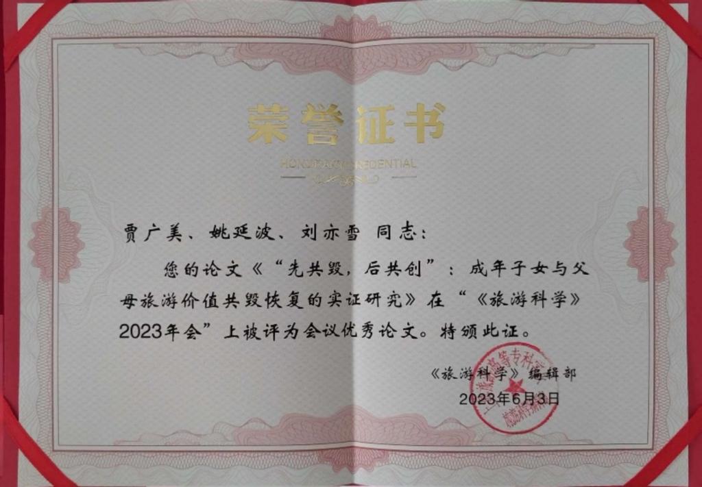 查看详情由上海师范大学、上海旅游高等专科学校主办,上海师范大学旅游学院、《旅游科学》编辑部承办的“《旅游科学》2023年会”于2023年6月1-4日在上海召开,此次会议汇聚了国内外文化和旅游研究领域的专家学者,分享研究成果,交流研究经验,共同推动中国式现代化与文旅高质量发展研究的不断深入。我院姚延波教授团队的文章“‘先共毁,后共创’:成年子女与父母旅游价值共毁恢复的实证研究”获评“2023《旅游科学》年会”优秀会议论...