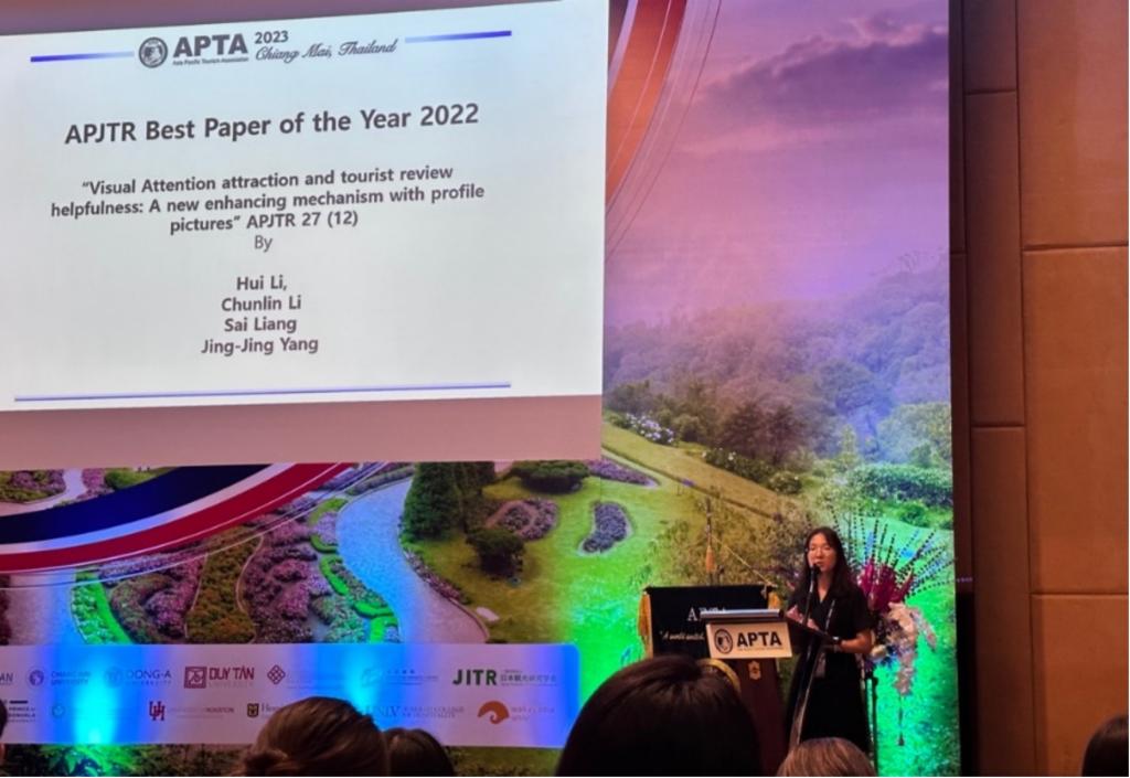 近日,亚太旅游学会(Asia Pacific Tourism Association,简称APTA)2023年度学术会议在泰国清迈举办,我院李辉教授、硕士生李春林、梁赛副教授同校外合作者共同完成的、刊发于Asia Pacific Journal of Tourism Research(APJTR)期刊上的研究成果”Visual attention attraction and tourism review helpfulness – a new enhancing mechanism with profile pictures”在会上被APTA国际学会和Routledge国际出版社联合授予APJTR...