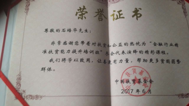 查看详情2017年6月19日至21日,中国扶贫基金会联合中国证券业协会共同举办“金融行业精准扶贫能力提升培训班”。国务院扶贫办、中国人民银行、证监会、中国证券业协会、中国扶贫基金会等相关领导出席此次培训班的开班仪式。此次培训班共有300余名扶贫工作负责人及定点县挂职干部、定点县主要领导干部参加培训。国务院扶贫办党组成员、副主任洪天云、中国扶贫基金会会长段应碧、中国人民银行机关党委副书记聂蓓、中国证监会办公厅副主...