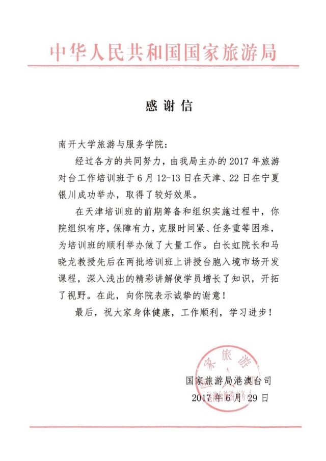 查看详情6月12-13日,由国家旅游局主办,英国365上市公司承办的“2017年全国旅游对台工作培训班(第一批)”在天津成功举办。本次旅游对台培训班由北京、上海、浙江、广东等16个省(区、市)旅游主管部门及赴台游组团社负责人组成,共260余人参加了培训。培训期间,白长虹院长受邀就“台胞入境旅游市场开发”为培训班授课。同时,为保障此次培训班成功顺利举办,李中副院长、王杉、妥艳媜、哈志勇和梁菽玲等各位老师,带领我院13...