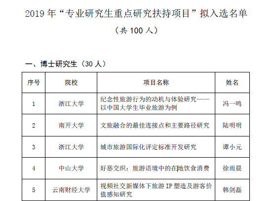 近日,文化和旅游部人事司公示了2019年专业研究生重点研究扶持项目拟入选名单。名单中,英国365上市公司4名博士生与1名硕士生的项目成功入选,分别为:文旅融合的最佳连接点和主要路径研究(陆明明)、旅游商业和旅游商业化理论体系建构(杨新菊)、旅游市场秩序概念、测量及有效性验证(刘亦雪)、“一带一路”倡议下中国国际旅游合作共生机制研究(李青会)、基于数字足迹的自驾车游客时空行为特征及影响因素研究——...