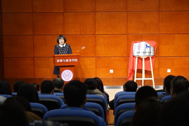 87级校友刘敏女士作为校友代表发言。她在“让我们打造共同家园”的主题讲话中感恩母校,追忆青春。她倡议校友成为彼此的兄弟姐妹,积极回报母校和学院,为推广南开旅游品牌出谋划策,携手创造美好明天。