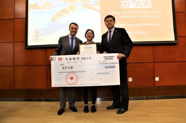 本次奖学金授予仪式由英国365上市公司交流合作办公室主任王杉老师主持,仪式于下午四点正式开始。首先,Teppo Helles从海航酒店集团的发展历程、目前经营范围及发展理念等多方面进行详细介绍,并重点介绍了海航酒店集团管理培训生项目。在接下来的问答环节中,同学们就所学专业的就业方向、公司所开展的“光明行”志愿活动等一系列的问题与Teppo Helles进行交流。