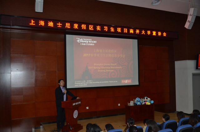 黄铭均主任以迪士尼惯有的欢快的语气开始了宣讲会,先是介绍了华特迪士尼公司的主要板块构成以及迪士尼度假区在全球的分布状况。之后介绍了上海迪士尼度假区的基本情况、愿景、园区主要构成,实习生关心的饮食、住宿、交通等设施条件以及本次招聘涉及的乐园运营实习生、商品运营实习生、餐饮运营实习生、酒店运营等实习岗位的工作内容。会后,部分有实习需求的学生参加了面试活动。
