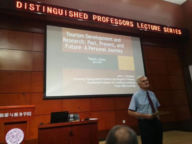 4月10日上午,John Crompton教授以“旅游发展与研究:昨天、今天和明天——个人有感”为题,结合自己的研究领域与经历进行阐述。Crompton教授的演讲形象生动、幽默风趣。讲座伊始,他从旅游吸引物、休闲旅游的动机、目的地定位三个微观层面介绍自己曾经做过的研究,并从游客满意与服务质量两个要素出发解释游客对旅游目的地的选择。之后,Crompton教授介绍了其在旅游领域的宏观研究,通过案例分享解释节事活动对社区的经济回报。