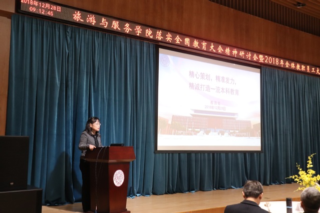 在下午的研讨中,全体教职工分三组讨论了学院本科教学质量改革及国际认证工作、研究生培养及科研工作、学院发展战略,并选派代表作了分组汇报。学院党政领导班子成员分别参加了三个小组的讨论,听取教职员工对学院工作的意见和建议。党委书记徐虹在大会总结发言中指出,全院教职员工要以习近平新时代中国特色社会主义思想和党的十九大精神为指导,全面贯彻落实本科教育教学工作会议精神,扭住立德树人这一总目标,加快推进双一流建设,明确责任,狠抓落实,力求实效,为百年校庆做出旅游人应有的贡献。