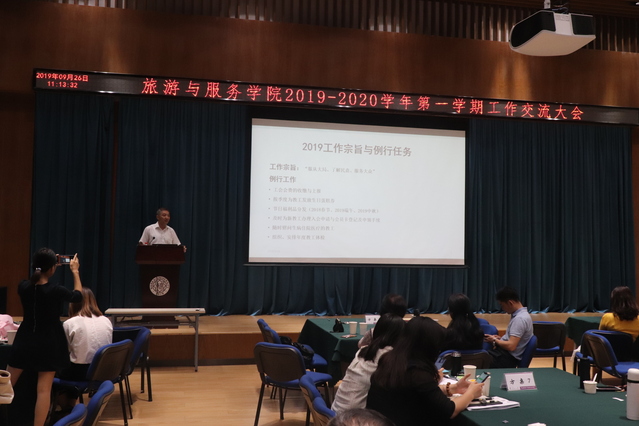 然后,各位分管副院长分别从本科教学、研究生教学及科研、学生工作、行政管理等方面做了深入的工作交流汇报。分管本科教学的姚延波副院长从八个方面汇报了学院本科教学的改革创新发展工作情况,尤其提出了随着教育部决定全面实施并启动一流本科专业建设“双万计划”,我院迎来了新学期本科教学高质量发展的新机遇。分管研究生教学及科研的陈晔副院长,全面总结了研究生教学工作的阶段性改革创新成果,指出了我院科研服务国家重大需求、面向国际化出精品、创建一流平台与团队的方向,尤其提出我院获批中国唯一一家“省部共建现代旅游业协同创新中心”的新机遇将引领学院实现新跨越。团委书记李慧代李中副院长作学生工作总结报告,李慧老师具体汇报了学生思想政治工作、安全稳定工作、就业工作等内容,她提出,当代大学生视野更加宽阔、追求更加务实、自主意识更加强烈,在这种新形势下团委也应主动调整工作思路和格局以应对新的挑战。最后,分管学院行政的杨德进副院长也做了全面的工作报告,提出了我院行政管理工作要以“服务对象满意”为宗旨的工作目标,在坚持“统一思想创一流、严风肃纪强作风、全体动员保平安”的工作主线下,明确了新学期工作的重点内容和举措,尤其提出要把完善行政管理制度作为重中之重。