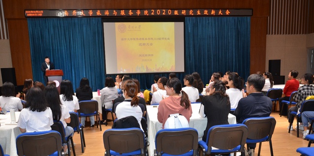 学院各系教师代表们分别向新同学表示了欢迎和致意。李春晓副教授作为教师代表上台讲话,她从“疫情结束后大家最想干什么”的调查引入,以实例从普通人和旅游研究者对看一个问题的不同角度加以对比,以新颖而发人深省的方式提出了对全体研究生新生的期待。