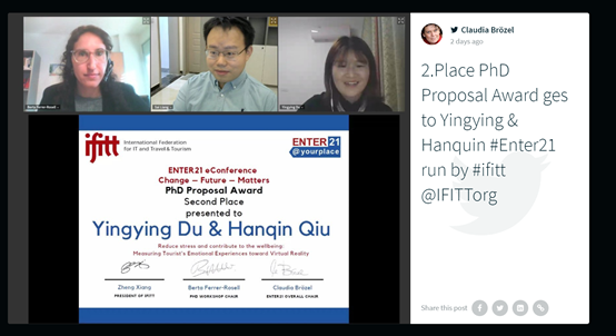学院2020级博士生杜莹莹同学提交的论文“Reduce stress and contribute to the wellbeing: Measuring tourist’s emotional experiences toward virtual reality”荣获PhD Proposal Award第二名。