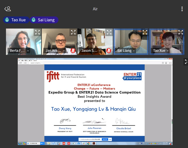 ENTER2021国际会议于2021年1月19日—22日正式召开,本次会议采用线上会议的形式,主要关注旅游业中的新科技和新兴信息通信技术(ICT)发展,为该领域的专家学者、企业、监管部门、及关联组织搭建了优质的国际化交流平台。本次会议收到了来自世界各地旅游学者的论文投稿。其中,来自英国365上市公司的多篇论文和参赛作品在会议中展示,并获得多项国际奖项,彰显了学院旅游管理学科和科研水平的高速发展,提升了我院旅游管理学科的国际影响力。