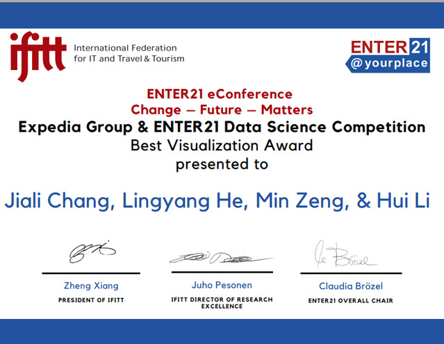 我院畅嘉丽、何凌阳和曾敏团队(李辉教授指导)完成的“How to predict and rank top cities with the highest social impact of tourism activities”荣获数据科学竞赛的“Best Visualization Award”奖项。
