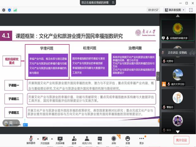 (通讯员代美玲)2021年2月3日,新年首期“南开旅游大讲堂——晋升教师论坛”通过线上腾讯会议顺利进行。旅游大讲堂是我院响应学校号召与相关要求,在原有讲座论坛体系基础上,通过重组、优化和新设等方式,改革并设立的交流制度与品牌,旨在全方位提升我院师生学术氛围。此次晋升教师论坛由副院长李辉教授主持,何会文副教授(申报教授)、梁赛博士(申报副教授)、妥艳媜博士(申报副教授)三位嘉宾就各自不同领域的研究成果进行分享与交流。