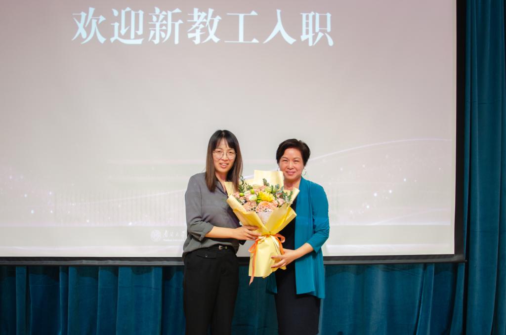 在致敬学院资深教职工后,易勇军书记正式介绍了今年学院新引进的优秀师资苏醒老师。苏老师曾在南京大学和荷兰乌得勒支大学人文地理专业就读,多次就职于国内外知名公司和研究机构,经验丰富,现阶段已正式投入到了学院的科研和教学工作中。邱汉琴院长向苏老师赠送了花束并代表学院热烈欢迎苏老师的加入,苏老师表示未来将不断向在座的各位优秀老师学习,尽快融入学院发展建设氛围,尽己所能为学院发展贡献力量。