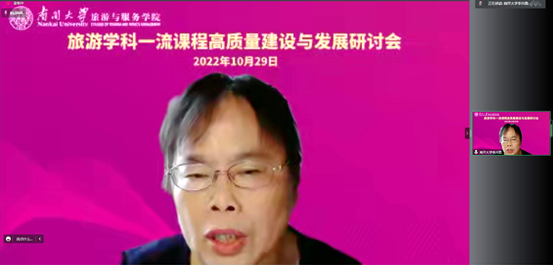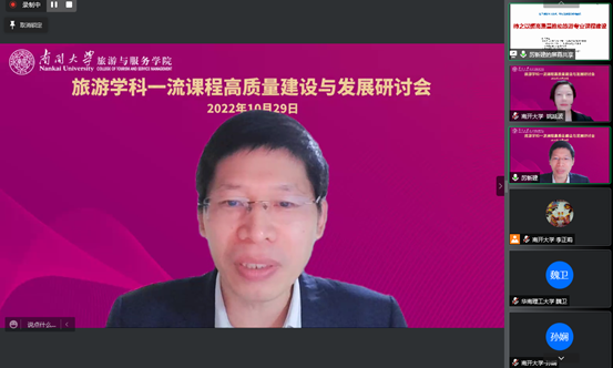北京第二外国语学院厉新建教授进行了“持之以恒高质量推动旅游专业课程建设”主题分享。厉教授一方面结合一流课程评审经历,分享了“金课”建设经验,如明确“金课”建设基本要求、重视“金课”内容优化和强调“金课”评价重点等。此外,厉教授结合多年教学经验和课程改革实践,以国家一流本科线下课程《旅游经济学》的建设为例,从旅游专业课程建设面临的主要问题,与科研有机结合的实践做法,课程教学效果的评价优化,技术赋能“教”“学”的创新举措,以及持续推进课程建设等方面作了深入浅出的分享。