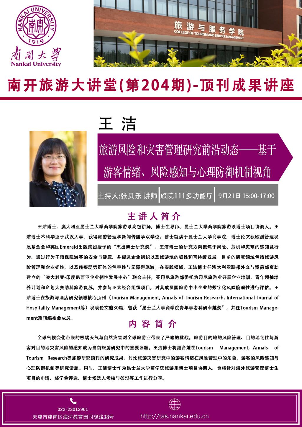 旅游大讲堂-顶刊成果讲座-王洁:旅游风险和灾害管理研究前沿动态——基于游客情绪、风险感知与心理防御机制视角
